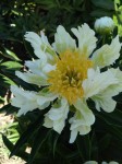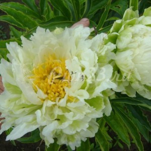 Очень редкий, коллекционный сорт. Цветок взбитый, в виде кремового шара лежащего на зеленых широких лепестках. Очень привлекательный необычный пион, станет украшением в любом саду.