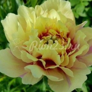 Ярко-желтый с зеленоватым оттенком и пурпурным пятном в центре.