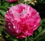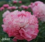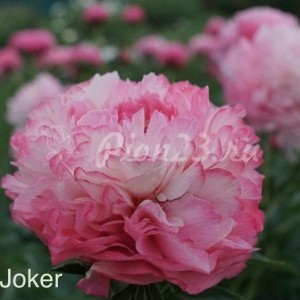 Пион Joker (Джокер). Межвидовой гибрид. Махровый. Цветок красивый, вначале тёмно-розовый, затем светлеет, а по краям появляется тонкая розовая кайма, все лепестки широкие, высота 80 см, стебли прочные, средне-раннего срока цветения. Куст сильный, цветы смотрят вверх.