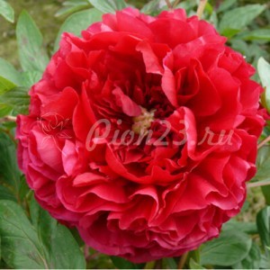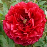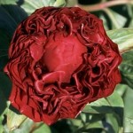 EDGAR JESSEP, Hybride, Bockstoce, 1958, , Махровый розовидный. Цветок диаметром 16 см, ярко-красный как бы атласный с розовым оттенком, в центре плотная макушка из более узких укороченных лепестков. Куст высотой 80 см. Стебли и листья как у пиона лекарственного (P. officinalis). Побеги весной красноватые. Средне-раннего срока цветения. У Бокстока все гибриды исключительно прекрасны и неповторимы.