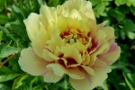 Ярко-желтый с зеленоватым оттенком и пурпурным пятном в центре.